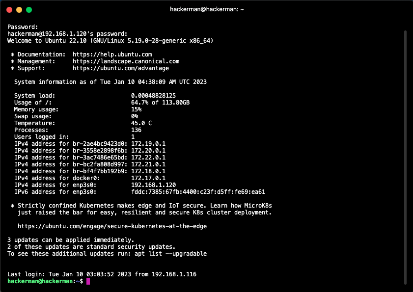 Notice also right above hackerman@hackerman:~$ we can read ” Last login: Tue Jan 10 03:03:52 2023 from 192.168.1.116 ” that is our laptop right there.
